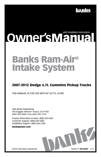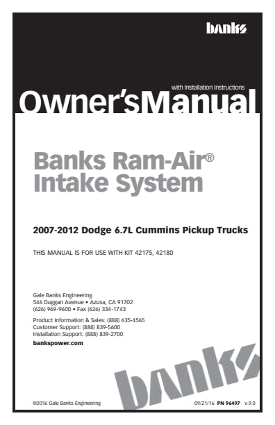 Outflows stock up to 50 Percent. Reduces exhaust gas temps (EGTs). Exclusive 4-1/2 inch bellows to accommodate engine movement. Enclosed housing keeps out hot, power-robbing engine air. Easy filter access for monitoring & cleaning. Testing, testing & more testing. Banks Ram-Air Intake Systems are tested and proven. They start out as CAD software prototypes and are put through flow simulations. After a hardware prototype is made, it's tested on a flowbench. Then it's tested on the vehicle. And finally, Banks' density-tests the Ram-Air against stock and many competitors. Proven design. Proven performance. Banks Ram-Air Intake maximizes the flow of cool, dense air to the engine for greater power and fuel economy. Thanks to its enclosed cold-air housing, huge inlet with giant dome-shaped filter, and streamlined internal design, it flows 50% better than stock! Infact, it performs so well that it delivers greater air density to the turbo's inlet than all competitors tested. Add on the optional Super-Scoop (42190 for standard bumper or 42191 for painted bumper), and the results are even better! Longer service life, too. An aftermarket exclusive: with 4-1/2" bellows, Banks Ram-Air accommodates engine movement, which protects the components and extends service life. What's more, Ram-Air is designed to not cause fault or error codes. It's all about density. And Banks Ram-Air Intake delivers. The harder you work your truck, the more Banks Ram-Air Intake improves power and fuel economy! Key Features: Enclosed housing keeps out hot, power-robbing engine air. Reduces exhaust gas temps and sooty, black smoke. Inhales cooler outside air for more power & MPG. Extends service life and requires fewer cleanings. Giant filter maximizes high-flow filtration. Extensively tested & validated. Outflows stock up to 50%. 5-year Limited Warranty. OILED Air Filter Element. Exclusive 5 inch bellows